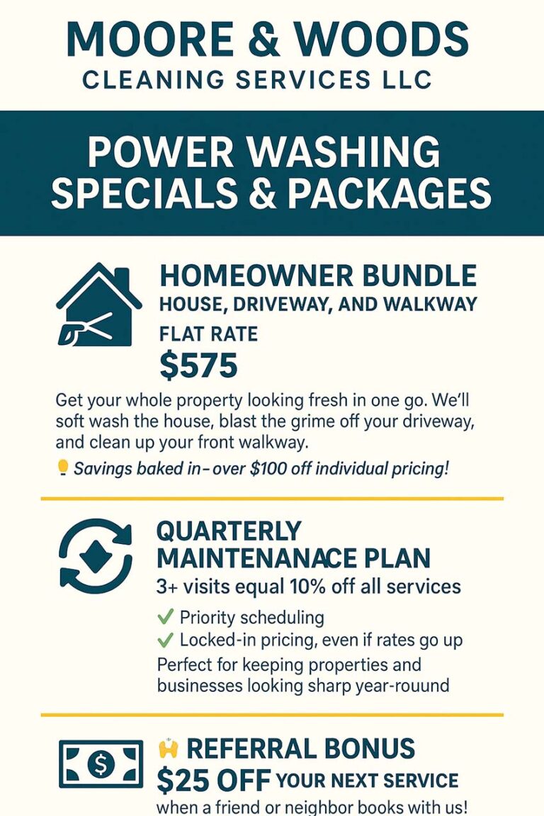 Moore and Woods Cleaning Services LLC is your trusted partner for top-tier residential and commercial cleaning throughout Mobile, Alabama and the Gulf Coast. Specializing in comprehensive cleaning solutions—including expert pressure washing—we’re committed to delivering spotless results that enhance curb appeal, safety, and comfort. Whether it’s a one-time deep clean or routine maintenance, we tailor our services to meet the unique needs of homes and businesses. At Moore and Woods, we don’t just clean—we restore and refresh your space with precision and care.
